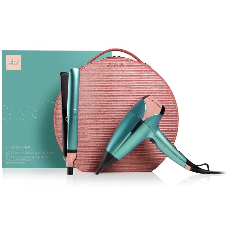 Dette er kronjuvelen inden for ghd's gavesæt, og det inviterer til en ekstraordinær stylingoplevelse med både ghd platinum+ styleren og ghd helios føntørreren i en henrivende jade farve. De præsenteres i et storslået støvet pink fløjlsetui*, til en værdi af 900 kr., og tilbyder en samlet og luksuriøs stylingpakke.