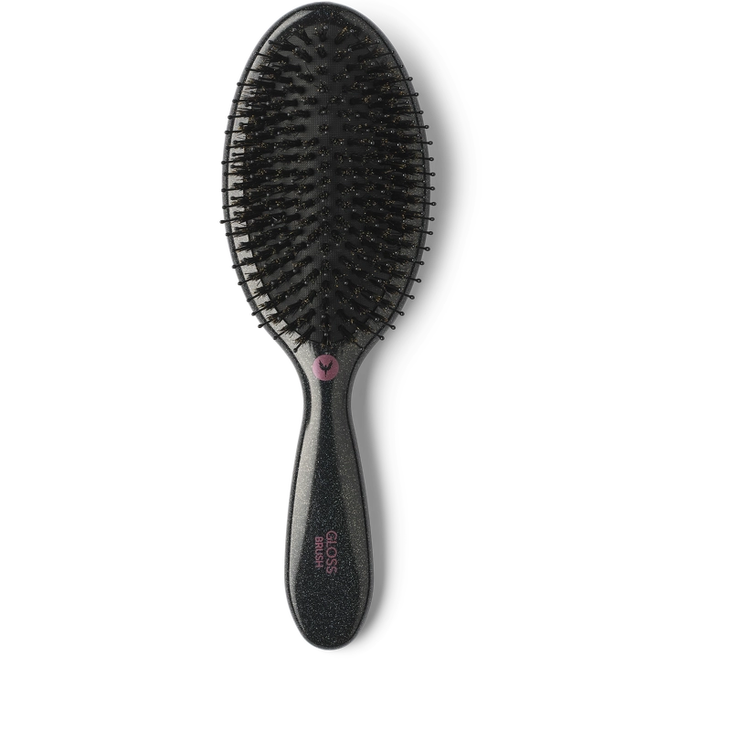 Gloss Brush kombinerer de fleksible SmartFlex-pigge med ægte vildsvinehår, som fordeler hovedbundens naturlige olier langs hele hårets længde.